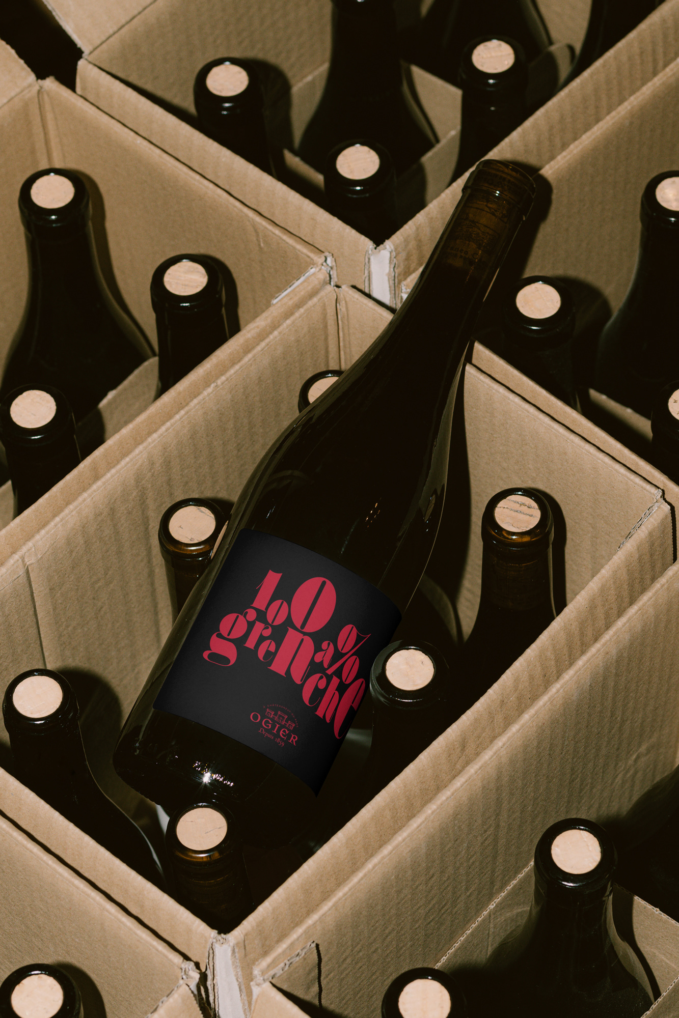 Création d'une gamme d'étiquettes pour les cuvées "100%" de la Maison Ogier, elles se veulent élégantes et modernes sortant des codes traditionnels.